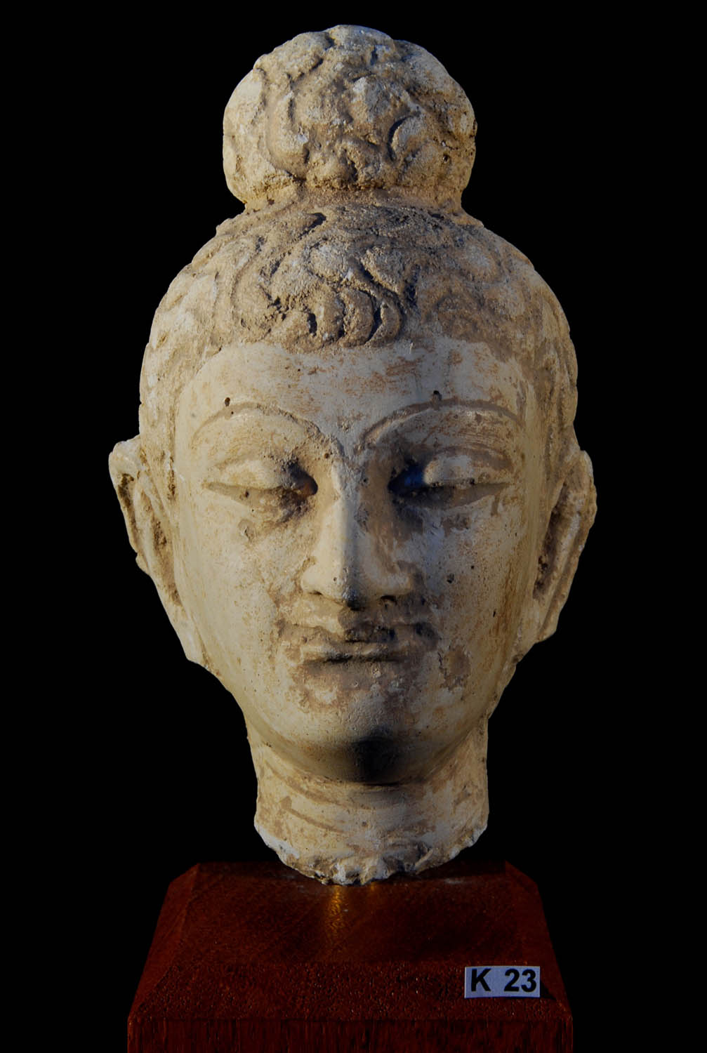 Description: Gandharan Carved Head of the Buddha. Kushan Period (2nd - 3rd Century AD). Superb finely rendered depiction of the head of Buddha with a serene compassionate countenance. Stucco. Gandhara Region (Ancient Pakistan/Afghanistan).