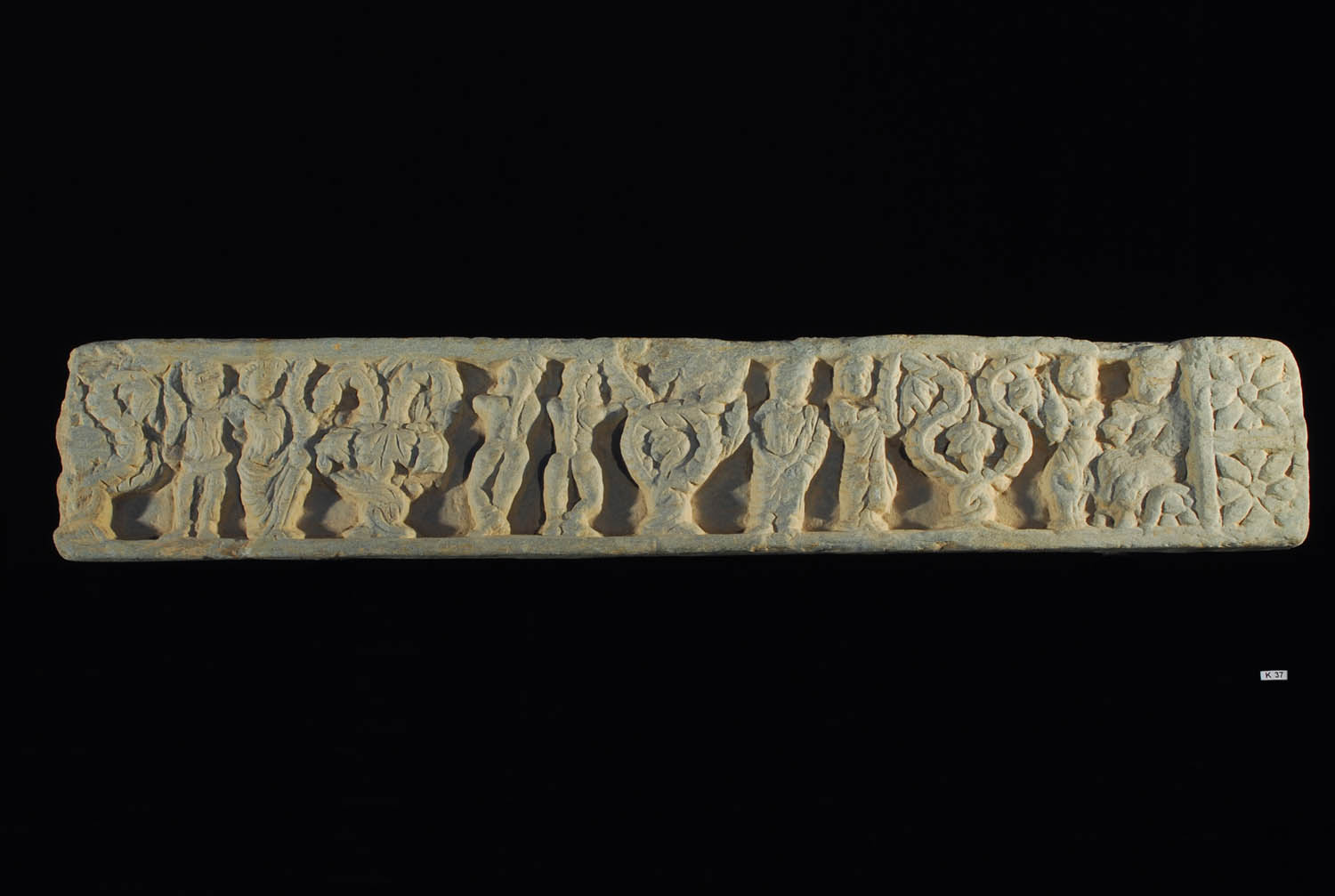 Greco-Buddhist carved relief frieze from an architectural monument or stupa portraying a scene from paradise. Two naked figures are seen accompanied by six fully robed figures interacting with flourishes of the divine garland.