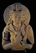 Description: Gandharan Stone Relief of a Bodhisattva. Kushan Period (150 - 200 AD). Greco-Buddhist depiction of a Bodhisattva or "Buddha-to-be", a supreme being capable of enlightenment, who in compassion for mankind delayed his entry into the state of Buddhahood in order to minister to others striving for that goal. This bodhisattva of the Gandhara school is very close to Hellenistic art in the draping of the clothes, but the wearing of jewellery and the cloak over the left shoulder, wrapped around the left arm and leaving the torso bare, is of Indian influence. Schist/Steatite. Gandhara Region (Ancient Pakistan/Afghanistan).