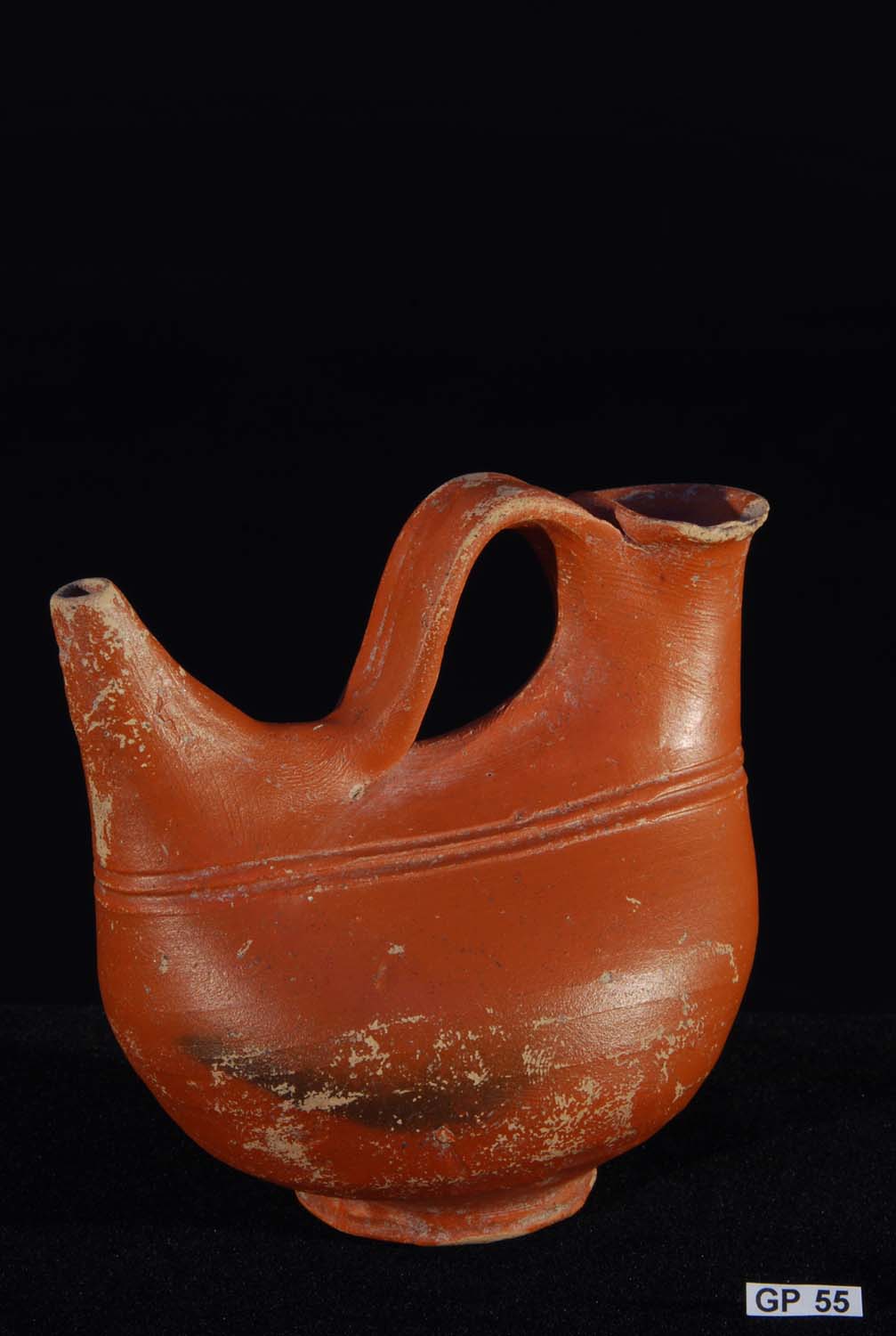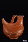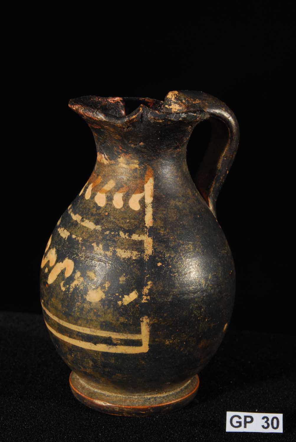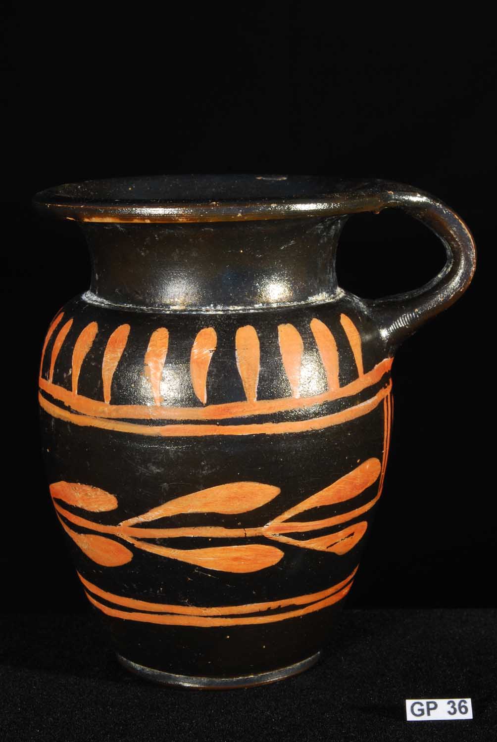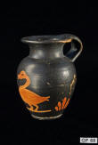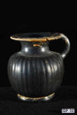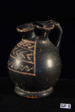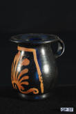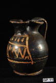 Description: Greek (Xenon-ware) Miniature Oenochoe. 4th century BC. Greek. Southern Italy. Metallic black glaze with orange pigment decoration.