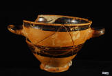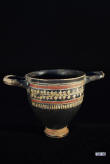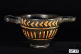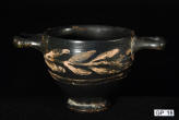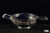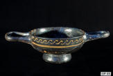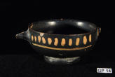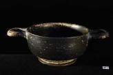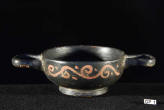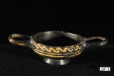 Description: Greek (Xenon-ware) Miniature Kylix. 4th century BC. Greek. Southern Italy. Metallic black glaze with orange pigment decoration.