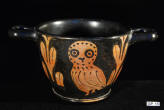 Description: Greek Apulian Red-Figure Owl Cup. 4th Century BC. Fine cup or skyphos with spreading foot and horizontal handles, each side depicting a standing owl between olive sprigs. Both the owl and olive were symbols associated with the goddess Athena and Athens. Attributed to an artist associated with the Pisticci Painter. Fine terracotta with black glaze. Taranto, Apulia, Southern Italy.