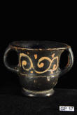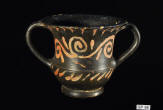 Description: Greek (Xenon-ware) Miniature Kantharos. 4th century BC. Greek. Southern Italy. Metallic black glaze with orange pigment decoration.