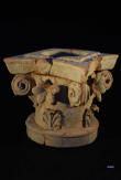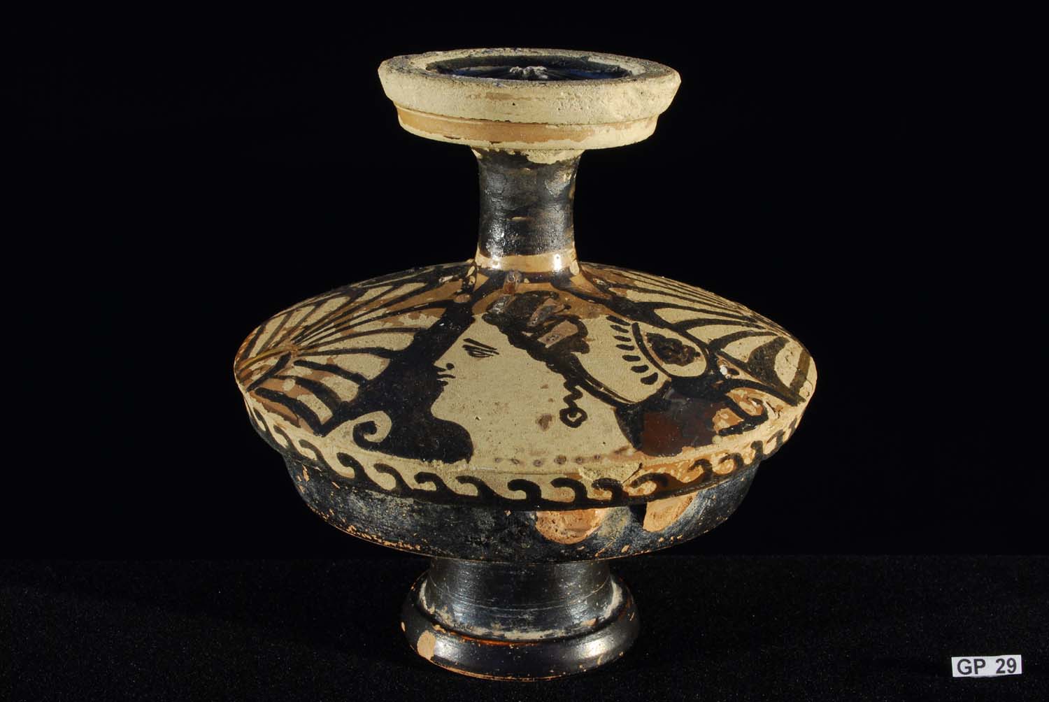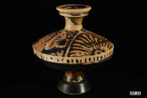 Description: Greek Apulian Miniature Lekanos. 4th Century BC. Lekanos in miniature form, the lid decorated with the heads of two ladies of fashion, palmettes between, the circular knob handle with a palmette top and the base in all-over black glaze. Fine pink clay.
