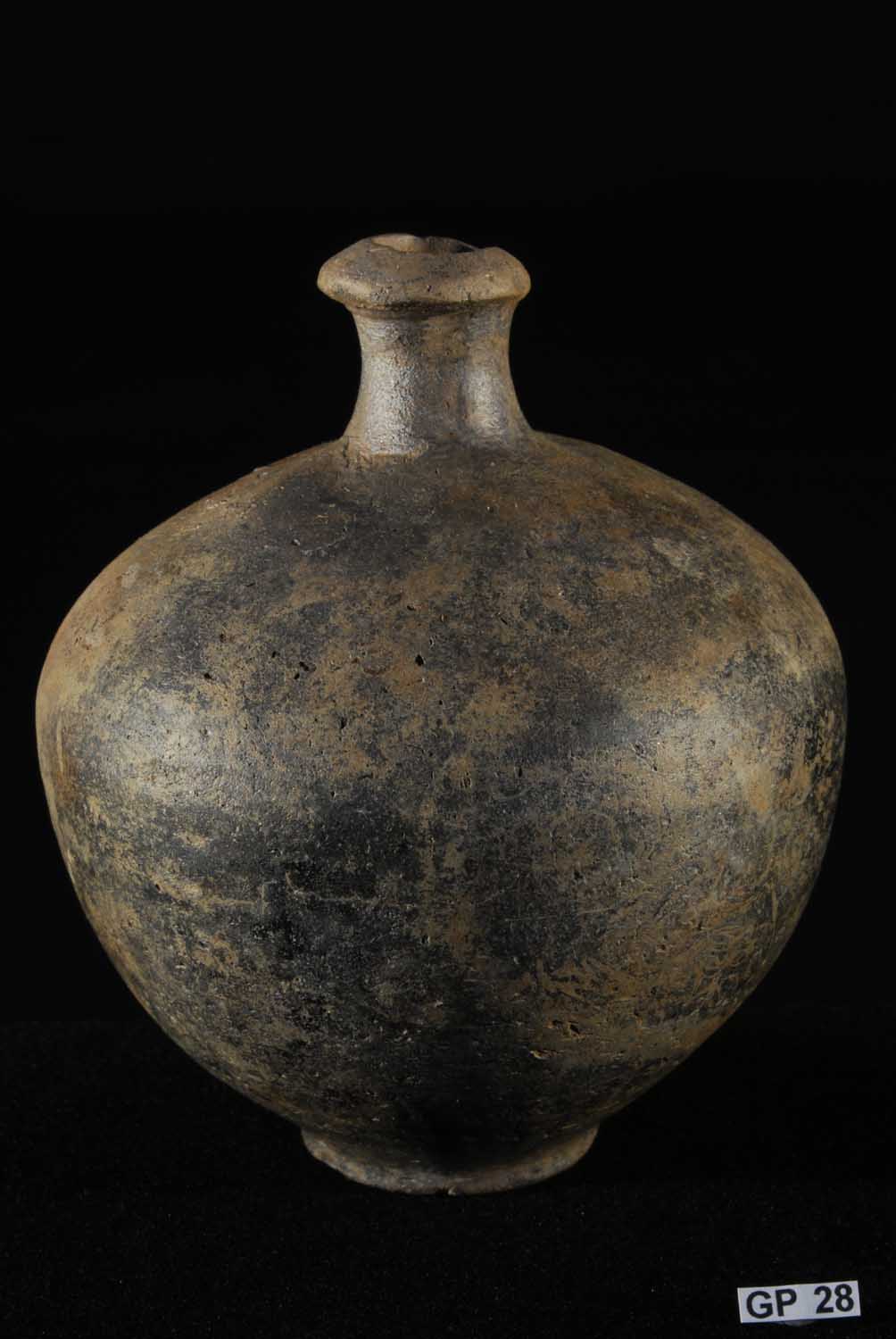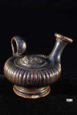 Description: Apulian Black-Glaze Guttus. Mid 4th Century BC. Exceptional large wide body guttus or flask with flared and ribbed spout and ring handle, the body with ribbed sectioning and the top featuring a relief of a bearded male, possibly Pan or a Gorgon. Light terracotta with a metallic black glaze. Greek Southern Italy.