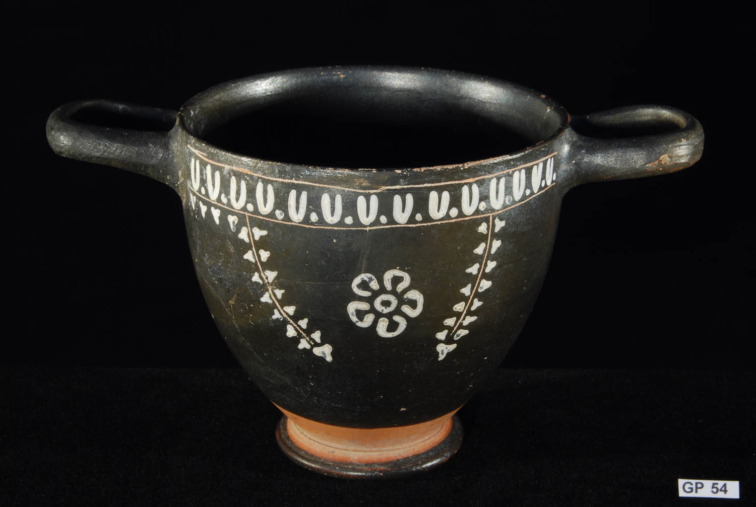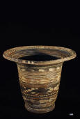 Description: Greek Messapian Painted Kalathos. 2nd half of 4th Century BC. Magnificent wide-flaring bowl decorated with applied buff painted friezes of laurel wreaths, tendrils, floral spray and dots in horizontal bands against a streaky black/brown ground, the rim with a deep groove around the outside. Fine buff terracotta with applied mineral pigments. Messapia, Greek Southern Italy.