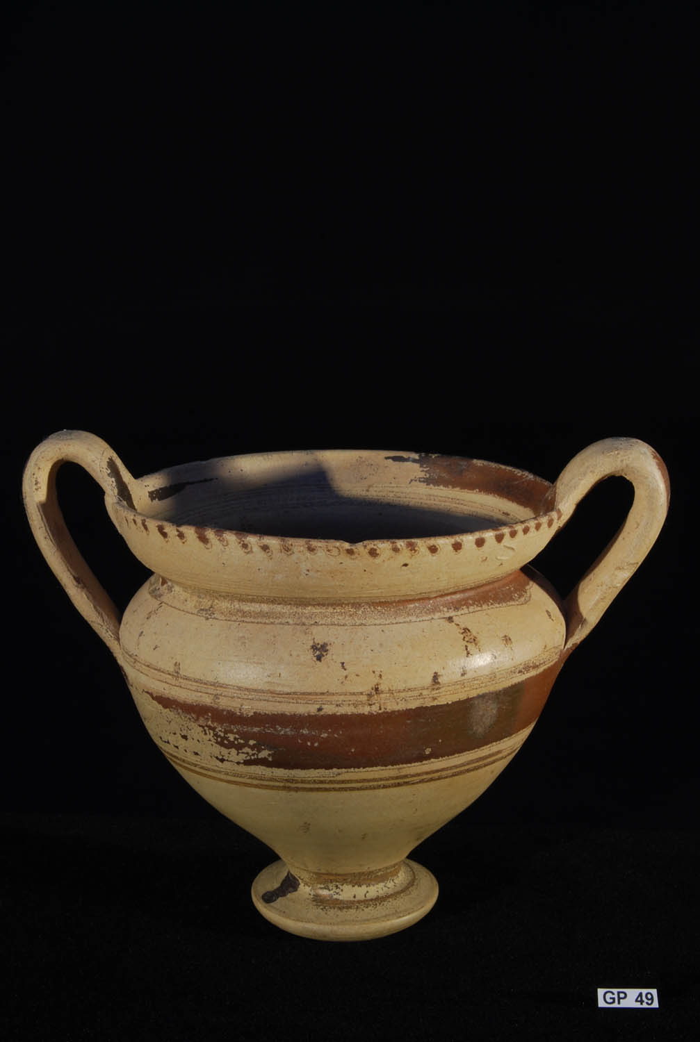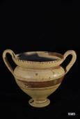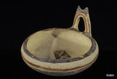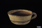 Description: Daunian Pottery Bowl/Cup. Second half of 5th Century BC. Shallow bowl of heavy fabric with concave base and strap handle in the form of an animal protome, the outside decorated with bands of red and brown, the inside with quadripart triangles. Fine buff clay..