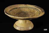 Description: Corinthian Bowl. 7th - 6th Century BC. Early shallow bowl on high cup foot, the decoration in brown and black in the form of band and geometric meanders, one edge of the vessel pierced at two points for suspension. Fine buff clay.