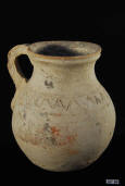 Description: Daunian Ware Olpe. 4th Century BC. Olpe vessel of fine style with everted lip and high strap handle, decorated in a white wash with red burnished firing marks. Fine buff clay.
