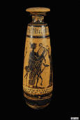 Description: Attic Black-Figure Alabastron. Early 5th Century BC. Superb black-figure decorated alabastron, the body decorated with a frieze of five figures on a buff-coloured natural ground with black concentric bands above and below. The decoration depicts a frieze of gods including Hermes and Apollo paying homage to Hera, wife of Zeus. Apollo is depicted playing his kithara while accompanied by a fawn as one of his attributes. Fine buff clay with black and white pigments.