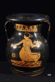 Description: Greek Apulian Pelike. First quarter of the 4th Century BC. Superb gloss-black glazed pelike used as a storage receptacle for wine or oil. On the neck is a reserved band with black egg-and-dot pattern motifs and at the base, a band with scrolls. One side of the vessel features a naked youth holding a strigil in his right hand, a cloak draped over his left shoulder. The other side depicts a maiden dressed in a chiton and himation. She carries a mirror in her right hand, a rosette in the field below it. She holds in her left hand a phiale while advancing to the left. Fine red clay. Taranto, Apulia, Southern Italy.