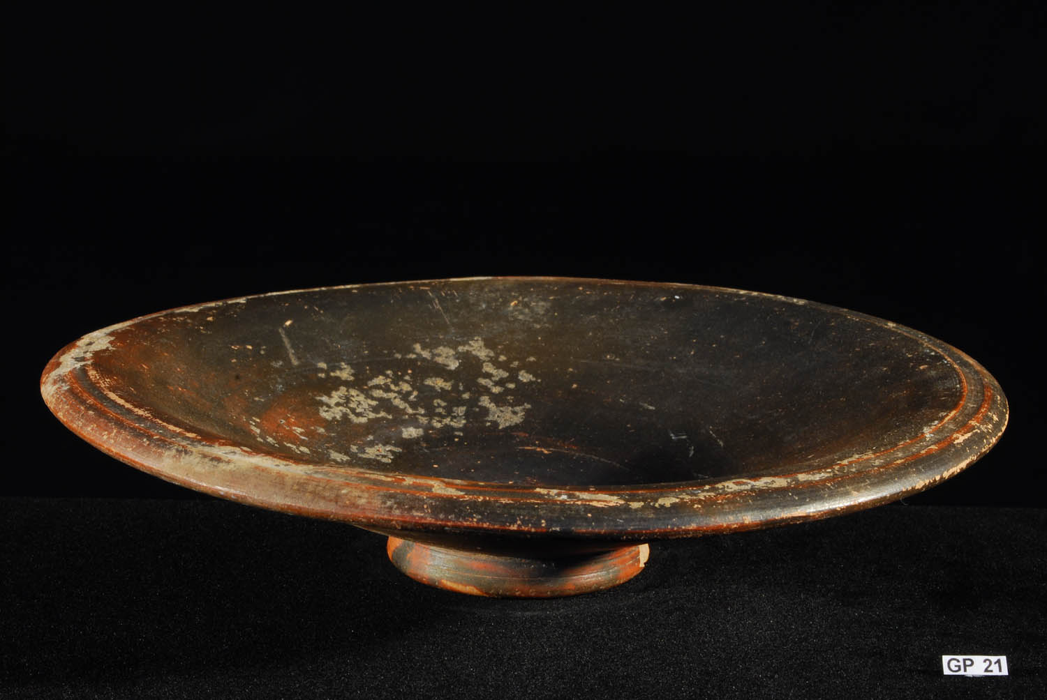 Description: Attic Black-Glaze Dish. 5th Century BC. Stylish conical form dish with grooved rim and a high ring foot. Ex British Museum Collection - duplicates sale. Greece. Fine buff clay.