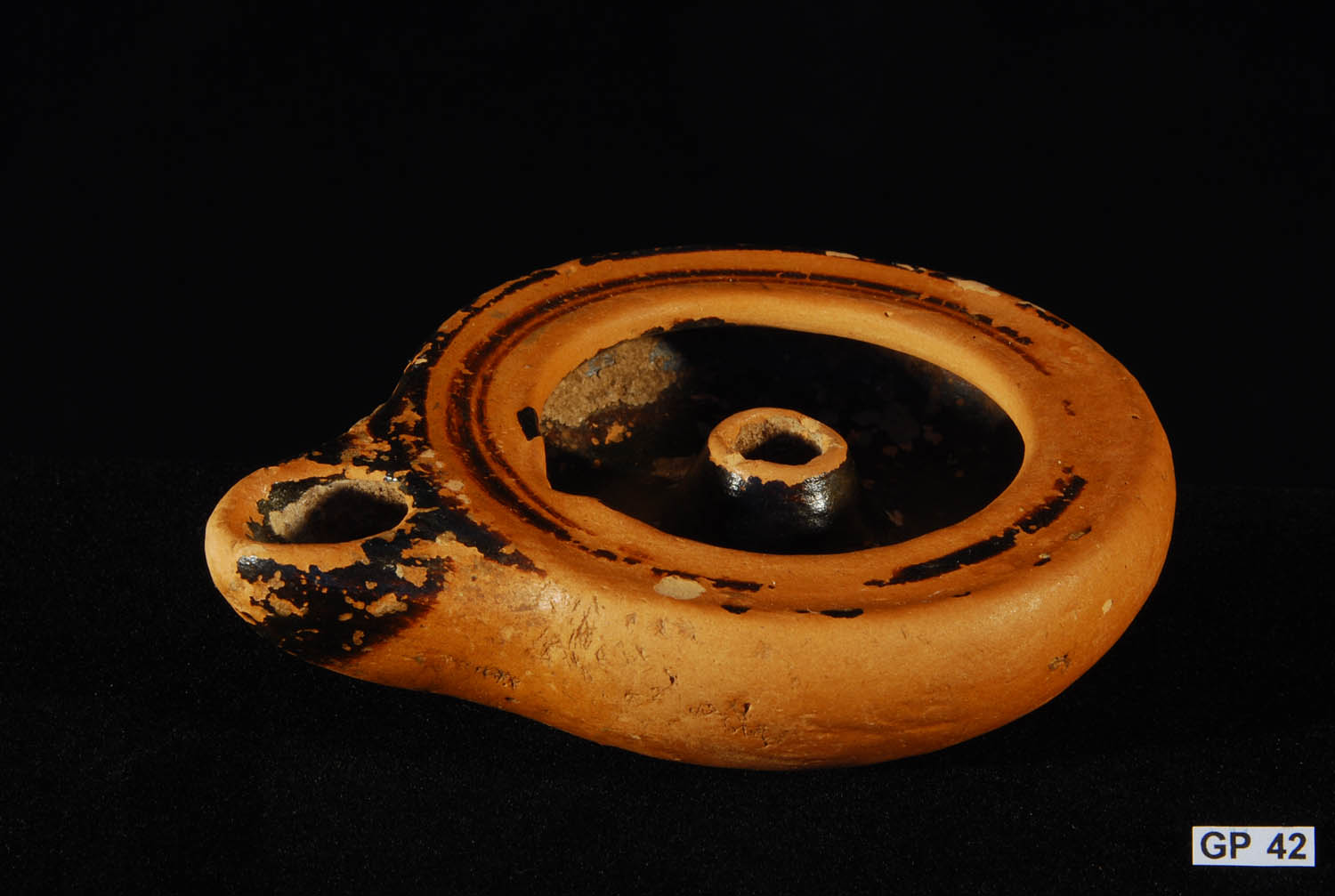 Description: Greek (Xenon-ware) Miniature Kylix. 4th century BC. Greek Southern Italy. Metallic black glaze with orange pigment decoration.