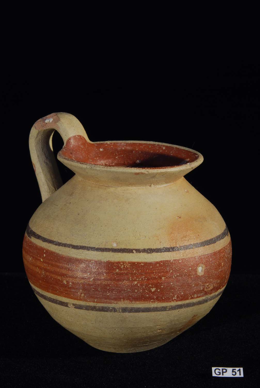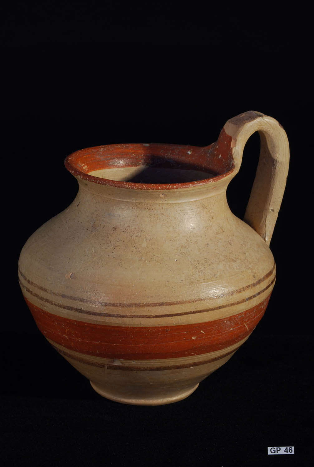 Description: Daunian Ware Pottery Olpe. 4th Century BC. Attractive vessel with broad band decoration in red and brown. Fine buff clay. Southern Italy.