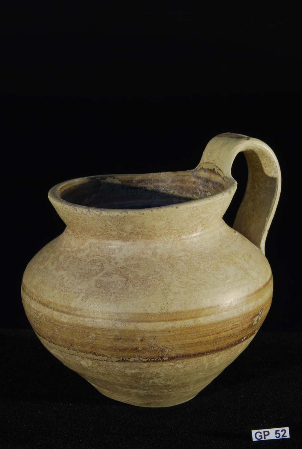 Description: Daunian Ware Pottery Olpe. 4th Century BC. Attractive olpe with greenish slip decoration and broad band brown and green pattern. Fine buff clay. Southern Italy.