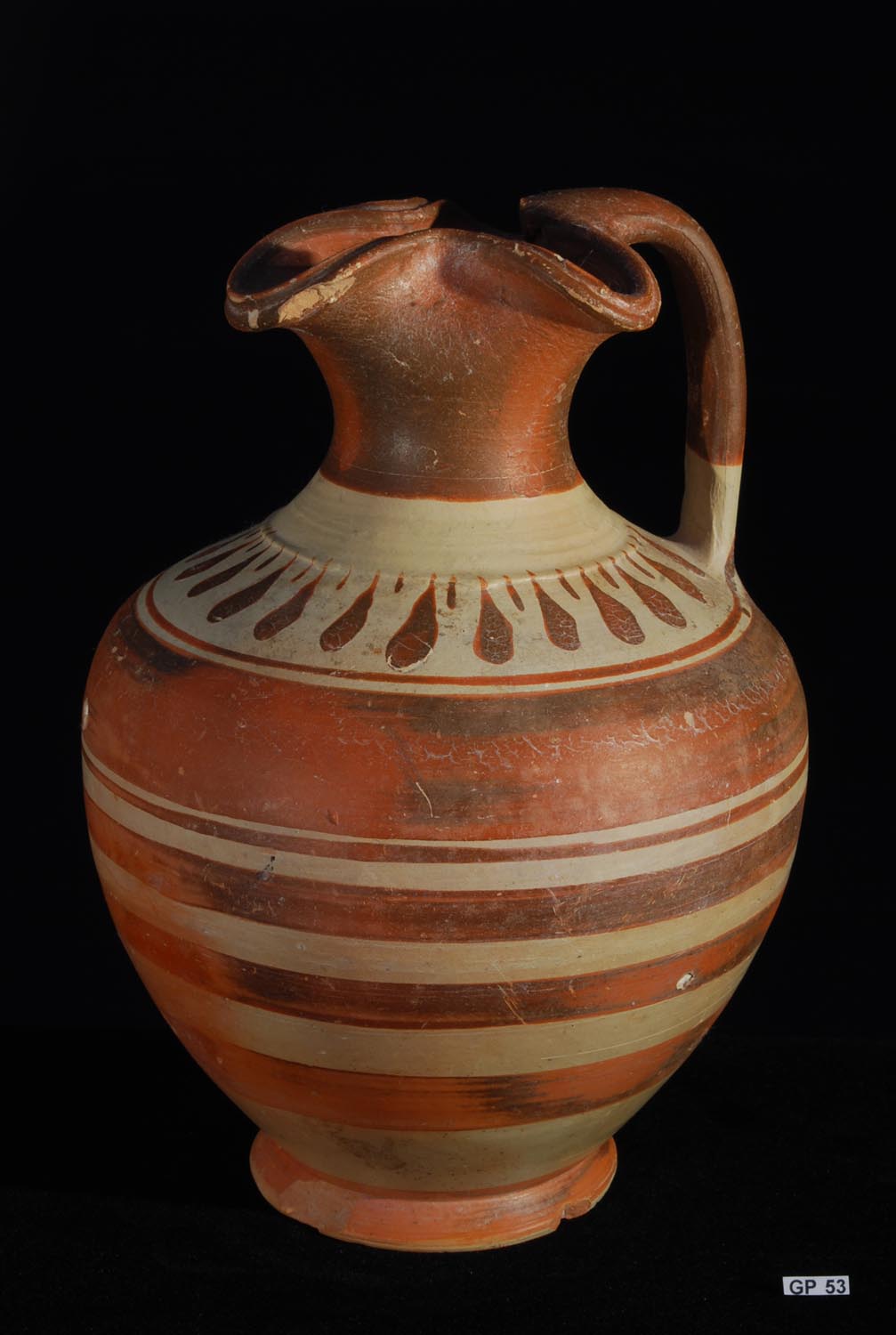 Description: Greek Trefoil Oenochoe. 4th Century BC. Superb large oenochoe with broad band decoration in red and brown. Fine buff clay. Apulia, Greek Southern Italy.