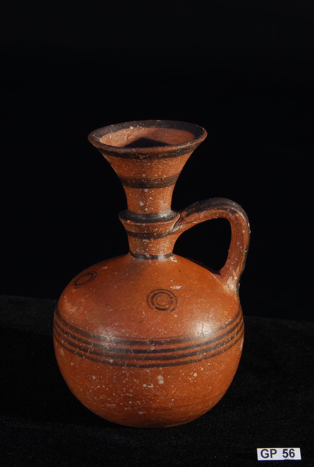 Description: Cypriot Juglet. Cypro-Geometric/Archaic, 800-600 BC. Superb miniature juglet with barrel-shaped body, vertical handle and a collared neck with flaring rim, the black-on-red decoration in the form of concentric bands and circles. Fine terracotta with polychrome pigment.