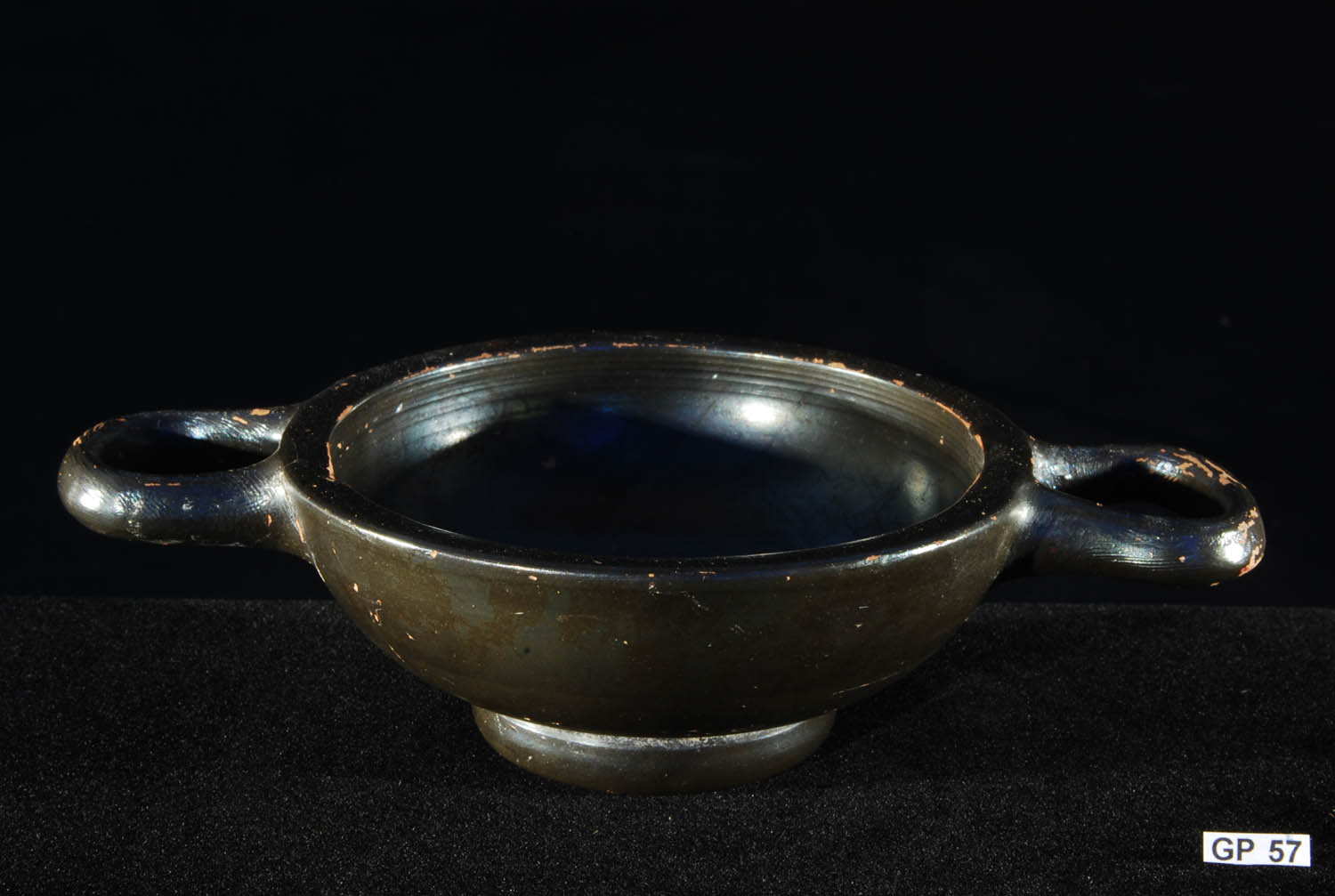 Description: Greek Black-Glaze Kylix. 4th Century BC. Shallow sessile kylix of thick fabric on high ring foot with two loop handles and metallic black glaze. Fine red clay. Magna Graecia.