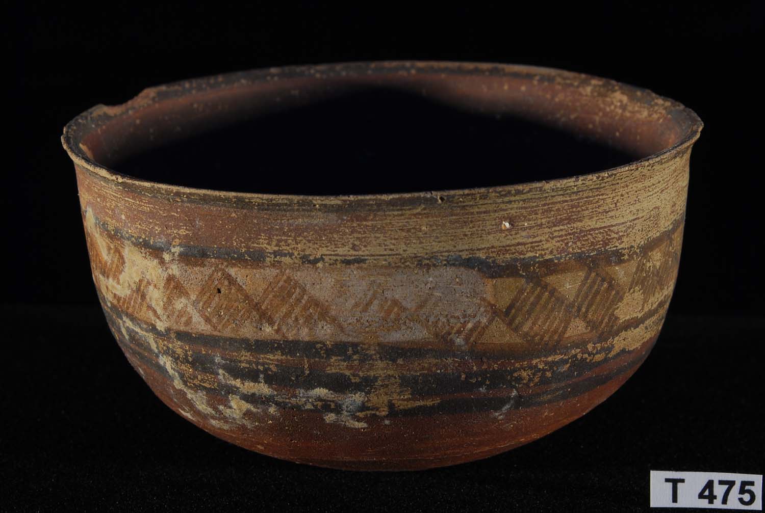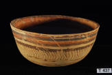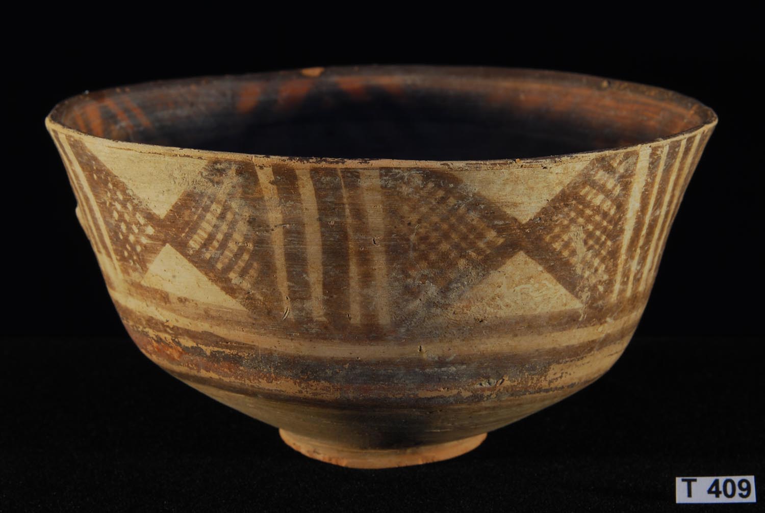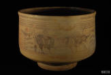 Large cream slip painted bowl with chocolate brown decoration featuring a frieze of lions, ibex or antelope and peepal trees.