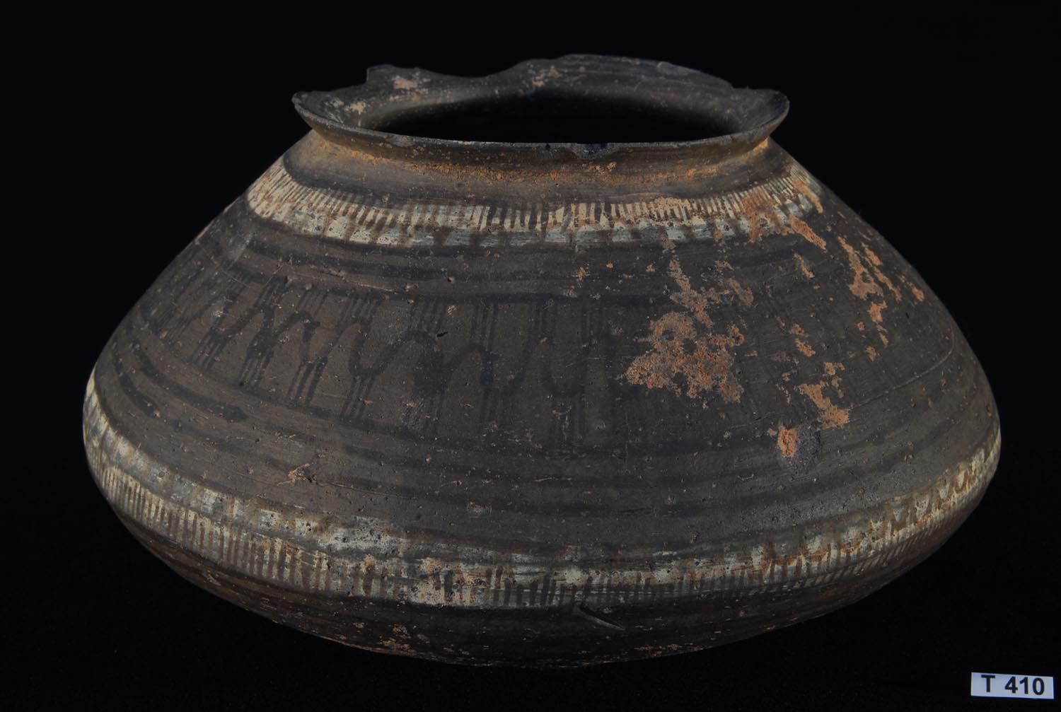 Magnificent Kulli phase pot of monumental proportions, the upper portion decorated with a frieze of Zebu bulls, trees including palms and peepal trees and arcane symbols, above all of which is further decoration consisting of parallel lines and stripes.