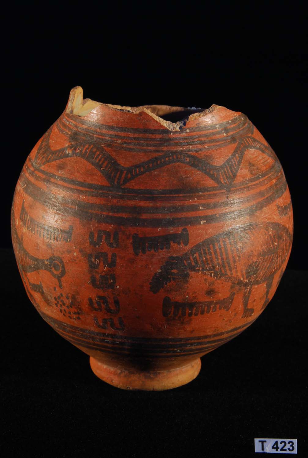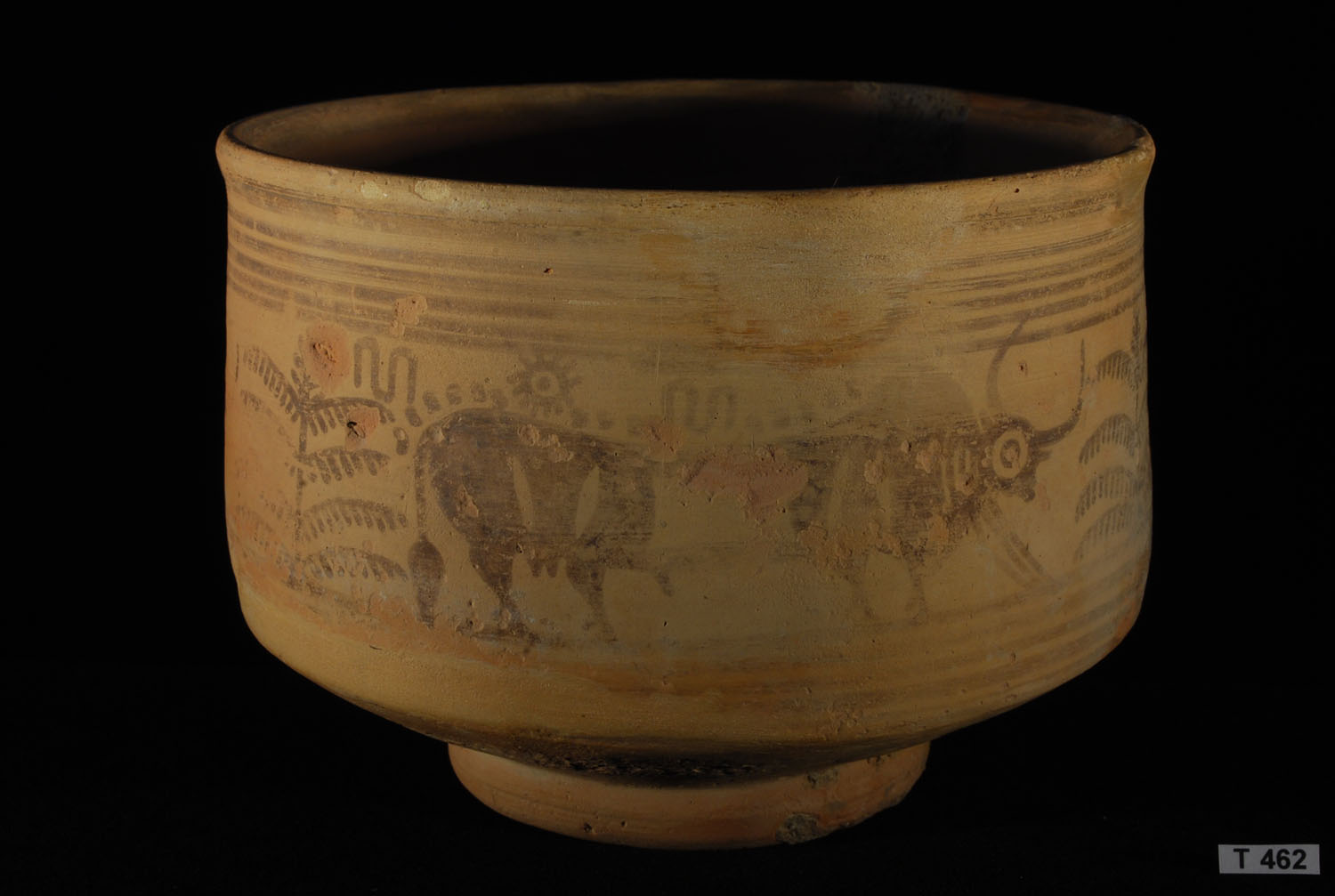 Description: Indus Valley Painted Pottery Vessel - Impressive large Kulli phase pot with a cream slip decorated in chocolate brown mineral pigment depicting Zebu bulls in large profile, above and below which are a series of parallel bands.