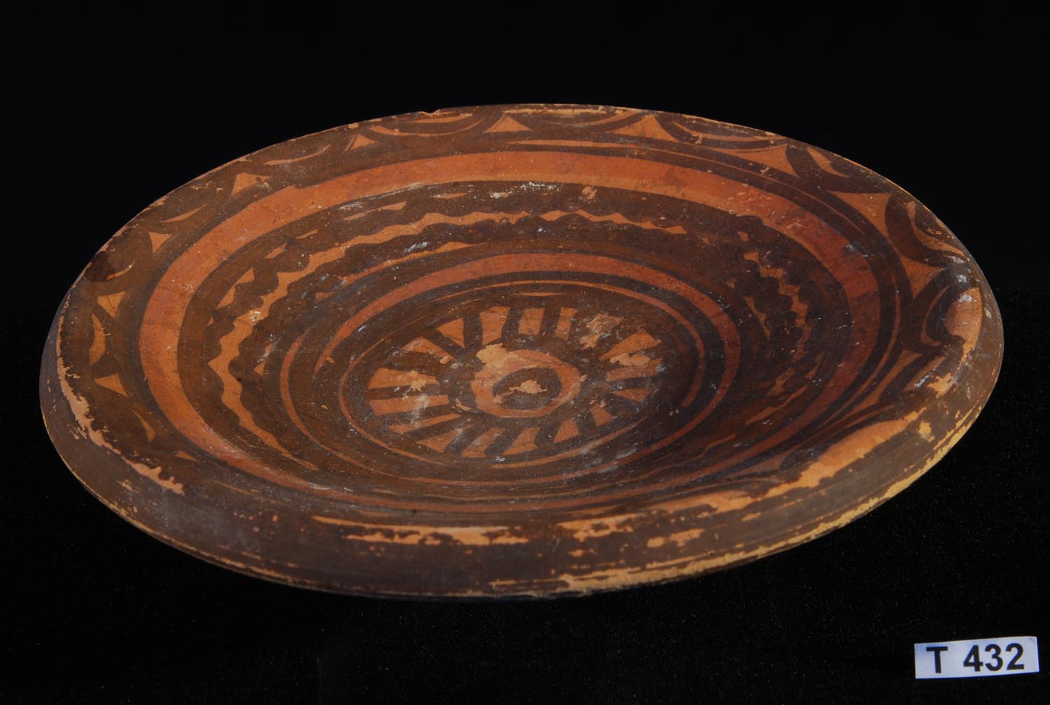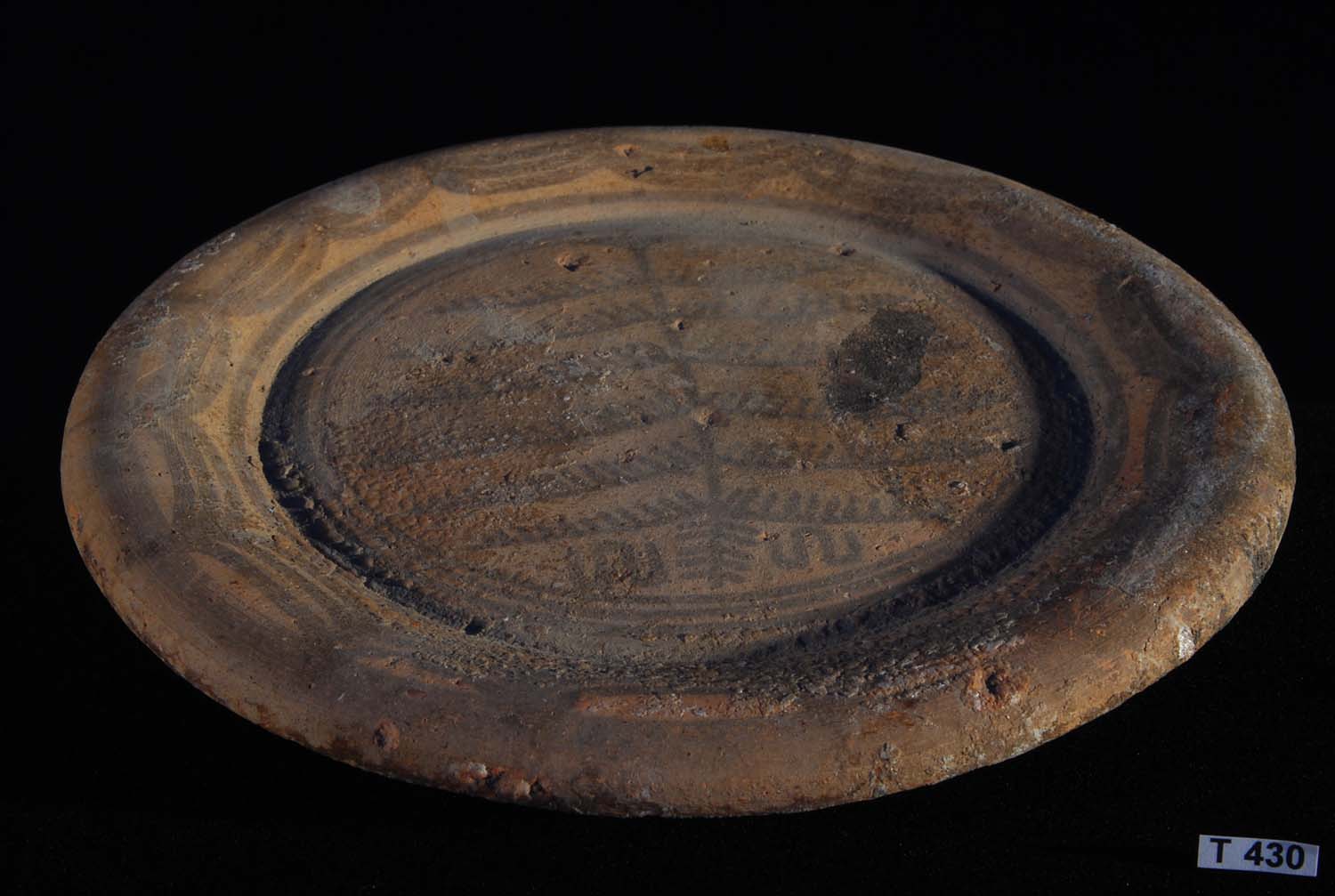 Magnificent large fish plate style bowl with cream slip decoration and overpaint in chocolate brown featuring arches, concentric banding and a frieze of two large fish similar in appearance to a beluga whale or blind porpoise. The centre of the vessel with a star motif.