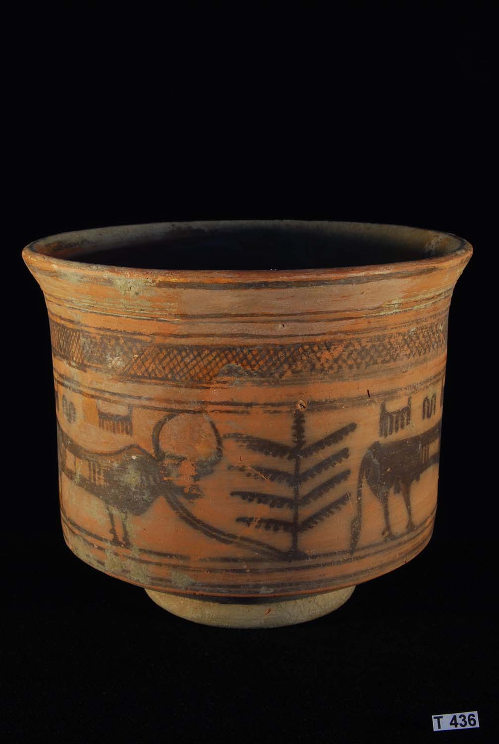 Description: Indus Valley Painted Pottery Vessel - Large Kulli phase vessel or pot stand, the outside centre of which is decorated with two friezes of Zebu bull and goats or antelope, above and below which are various geometric and banded motifs.