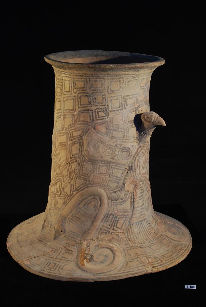 Exceptional rare pottery stand of cylindrical form with wide flaring base providing a stable stand. The piece decorated in applied relief with an eagle with outstretched wings, the claws clutching coiled serpent figures at the base. The piece is decorated in a cream slip with applied polychromy mineral pigment decoration with chocolate brown bordering and remnant red colouring.