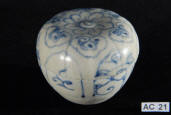 Description: Early Annamese (Vietnam) Lidded Pot 15th - 16th century. Of circular form with a flattened cover, the white stoneware fabric decorated in underglaze cobalt blue with a transparent glaze also covering the interior and base, the top and bottom decorated with floral motifs.