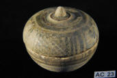 Description: Sukhothai Miniature Pot . 14th -15th Century AD. Sawankhalok ware ceramic lidded pot with iron brown and white decoration and applied fruits (mangosteen) motif to the top and with brown glazed interior. Thailand.