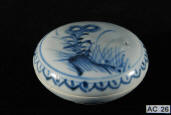 Description: Early Annamese (Vietnam) Ointment Pot. 15th - 16th Century. Of circular form with a flattened cover, the white stoneware fabric decorated in underglaze cobalt blue with a transparent glaze also covering the box interior and base, the top and bottom decorated with a central chrysanthemum spray medallion.
