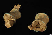 Ban Chiang has been the subject of much controversy over claims for very early Neolithic settlement and the inception of bronze and iron working. The 1974 excavation of Ban Chiang revealed Bronze Age graves over a Neolithic cemetery, while Bronze Age graves were at the base of the sequence in the area opened a year later for investigation. It is now considered likely that Bronze casting was established within the period 1500 – 1000 BC. The early Bronze Age graves in this area underlay the remains of a clay furnace surrounded by ceramic crucible fragments still containing bronze from the casting process. Casting moulds such as this pair and crucible fragments have also been found since the time of the 1974 excavation at the site. Copper and tin ingots must have been obtained by exchange, heated and then locally cast in such sandstone bi-vale moulds, considered especially rare as an intact pair.