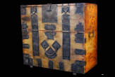 Description: Korean Blanket/Marriage Chest (Bandaji). 19th century (Yi Dynasty), Pyongyang, North Korea. Originally from Pak Chung, close to Pyongyang, this piece is decorated with pierced black iron resembling lace and representing the south gates (namdaemun) of the city.
