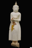 Description: Marble Standing Buddha. Superb and rare Burmese temple standing Buddha in the Shan style with remnant traces of gold leaf gilding. The Buddha, with serene pose and countenance holds an offering bowl and is attired in a long flaring garment to the ankles. With remnant original lacquer and gilding and on original plinth as constructed. Shan style c. Late 18th century, Burma.