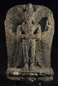 Description: Volcanic Stone Relief Carving of Lakshmi. Lakshmi is a major Hindu goddess who originated perhaps as a mother goddess but who now represents wealth and prosperity. She is identified as the consort of Vishnu and the epitome of feminine beauty. In her right hand she grasps a discus, in her left hand a conch shell, while her two front hands hold a lotus flower. c. 11th century AD, Yogyakarta, Java, Indonesia.