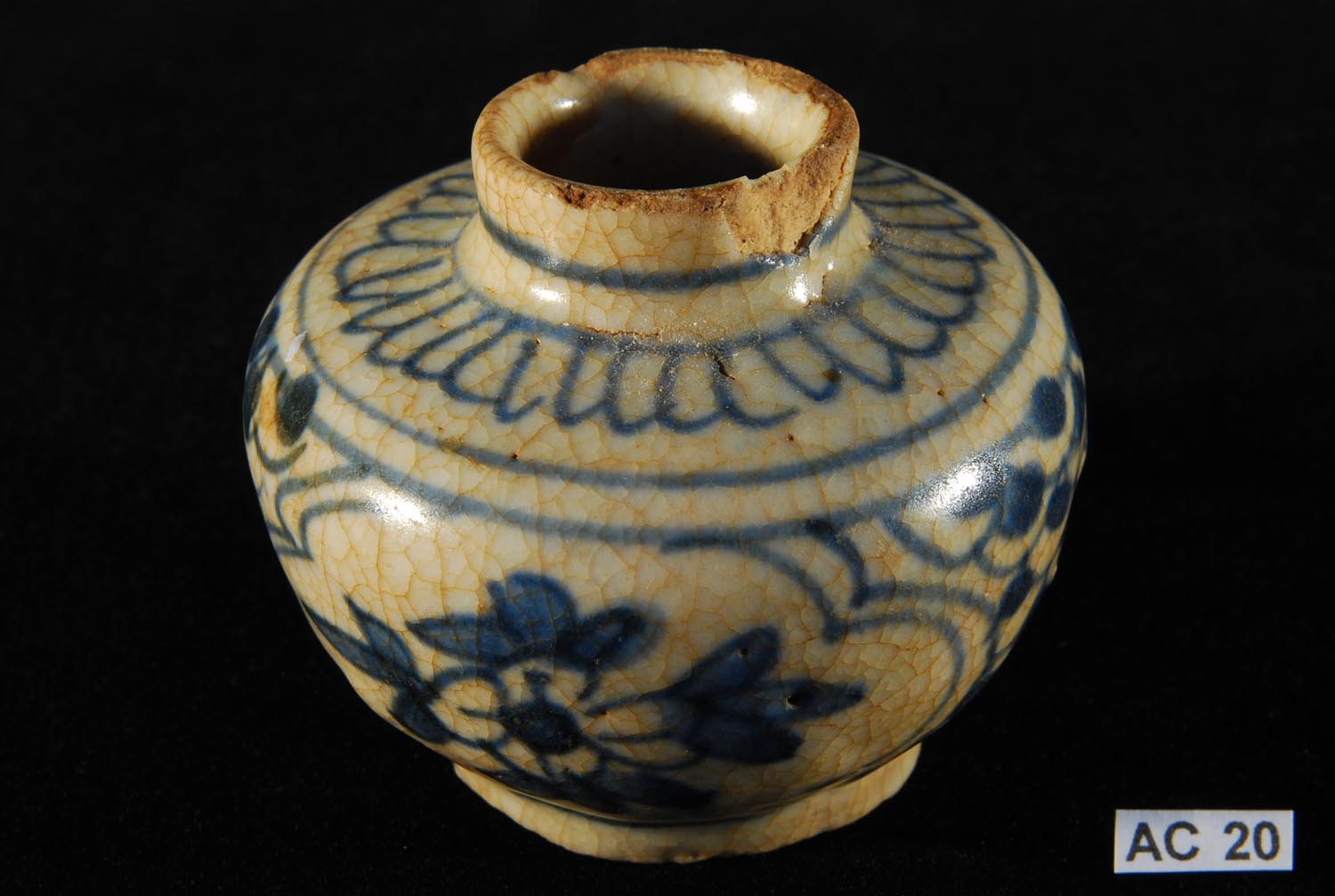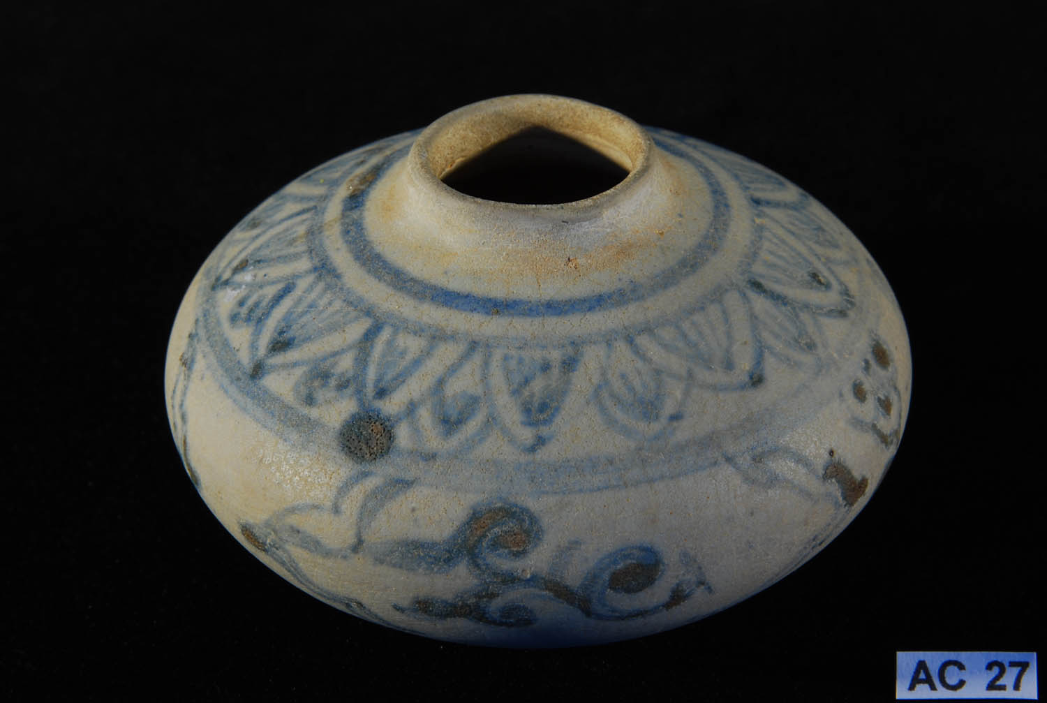 Ming Dynasty (1368 - 1644). Of flattened globular form with collar of lotus petals and a band of cloud scrolls in underglaze cobalt blue and brown on a beige coloured biscuit. Ex wreck of the Hoian, 16th century.