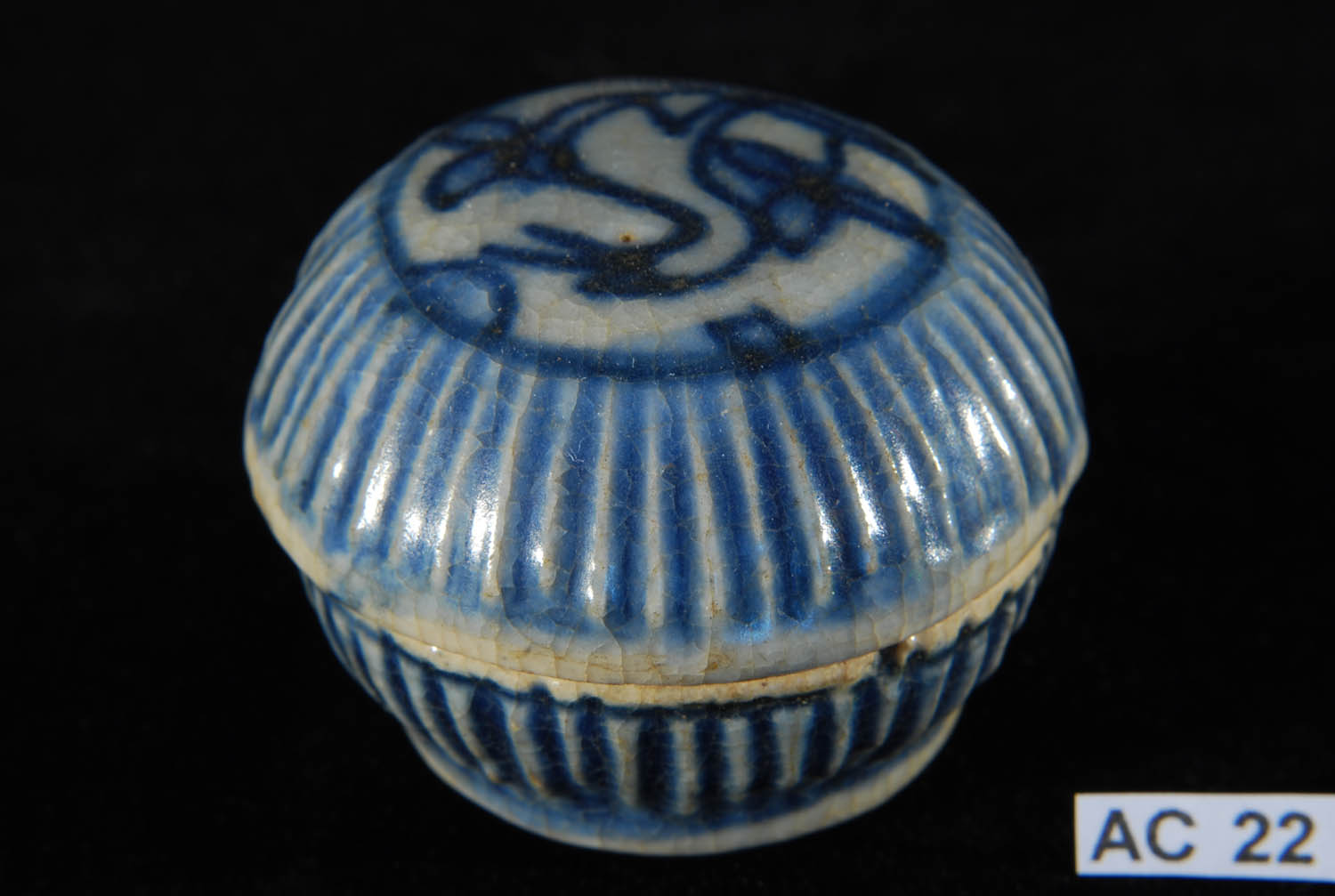 Description: Early Chinese Miniature Lidded Pot. Ming Dynasty (1368 - 1644). Of circular form with a flattened cover and scalloped rim at the shoulder, decorated in underglaze cobalt blue with a central floral medallion and lotus-petal lappets on a grey biscuit with a transparent glaze. 16th century.
