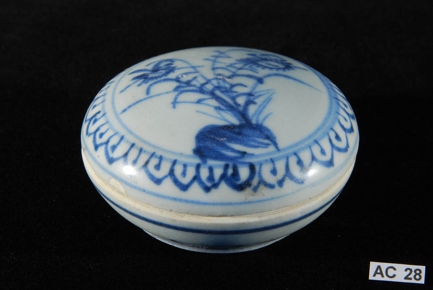 15th - 16th century. Of circular form with a flattened cover, the white stoneware fabric decorated in underglaze cobalt blue with a transparent glaze also covering the box interior and base, the top and bottom decorated with floral motifs.
