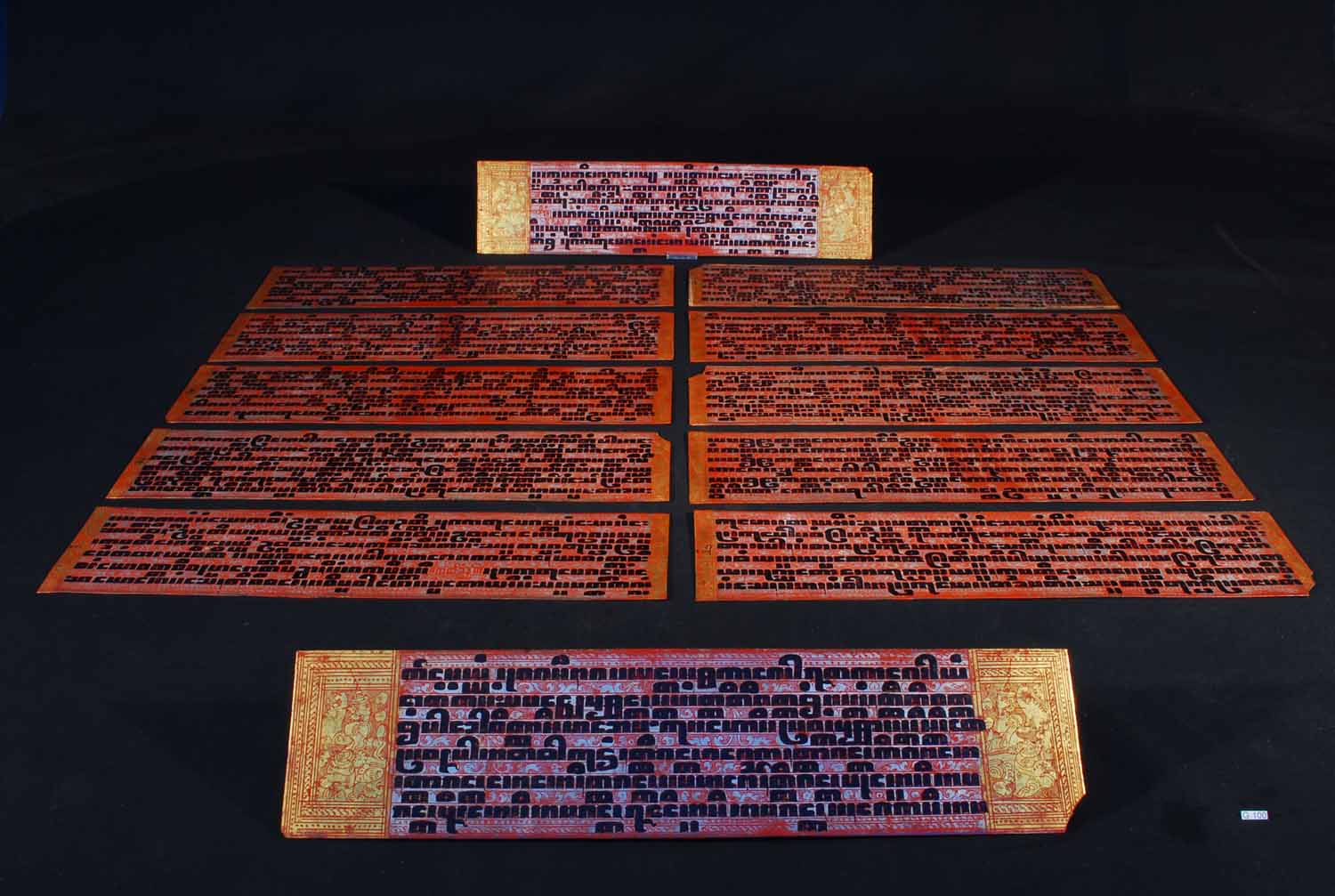 Description: Buddhist Sutra Boards. Of Burmese/Thai origin, each board double faced and of enamel lacquered silk fibre construction with gilt and red lacquer coating. The text in black relief enamel has been written on a background of red and metallic silver and probably relates to the ordination rites of a Buddhist monk. Impressive and in superb original condition, early 19th Century.