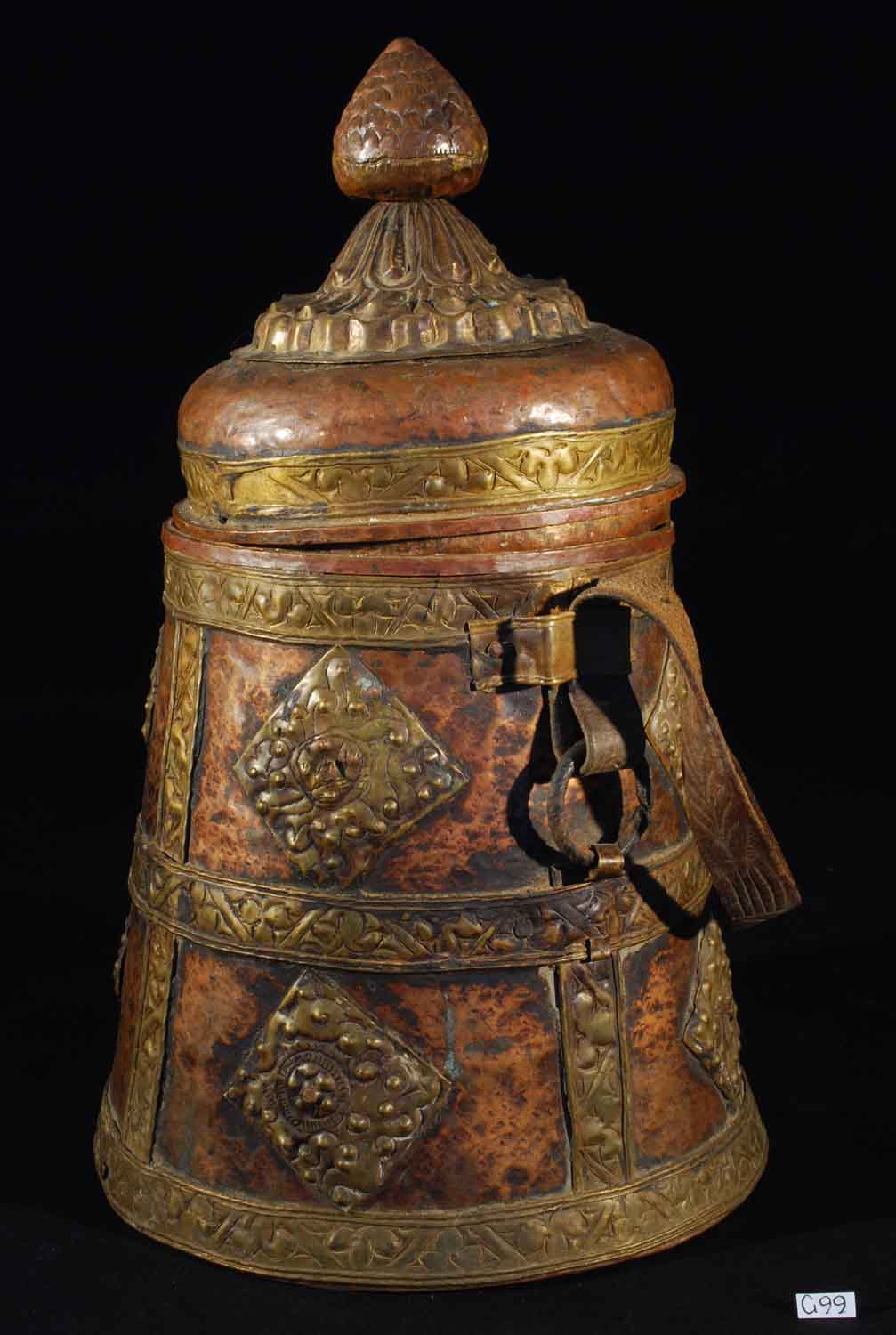 Description: Himalayan Ritual Container. Early Buddhist lidded ritual container with beaten copper and brass embellishment and leather strap handle, Tibet/Nepal, 19th Century.
