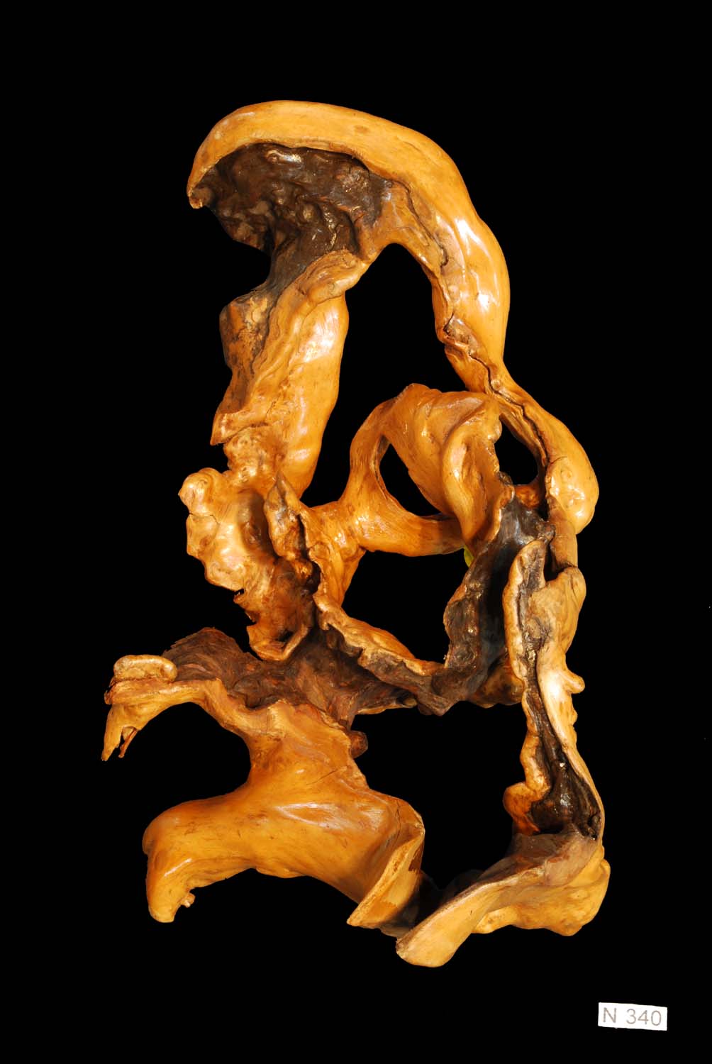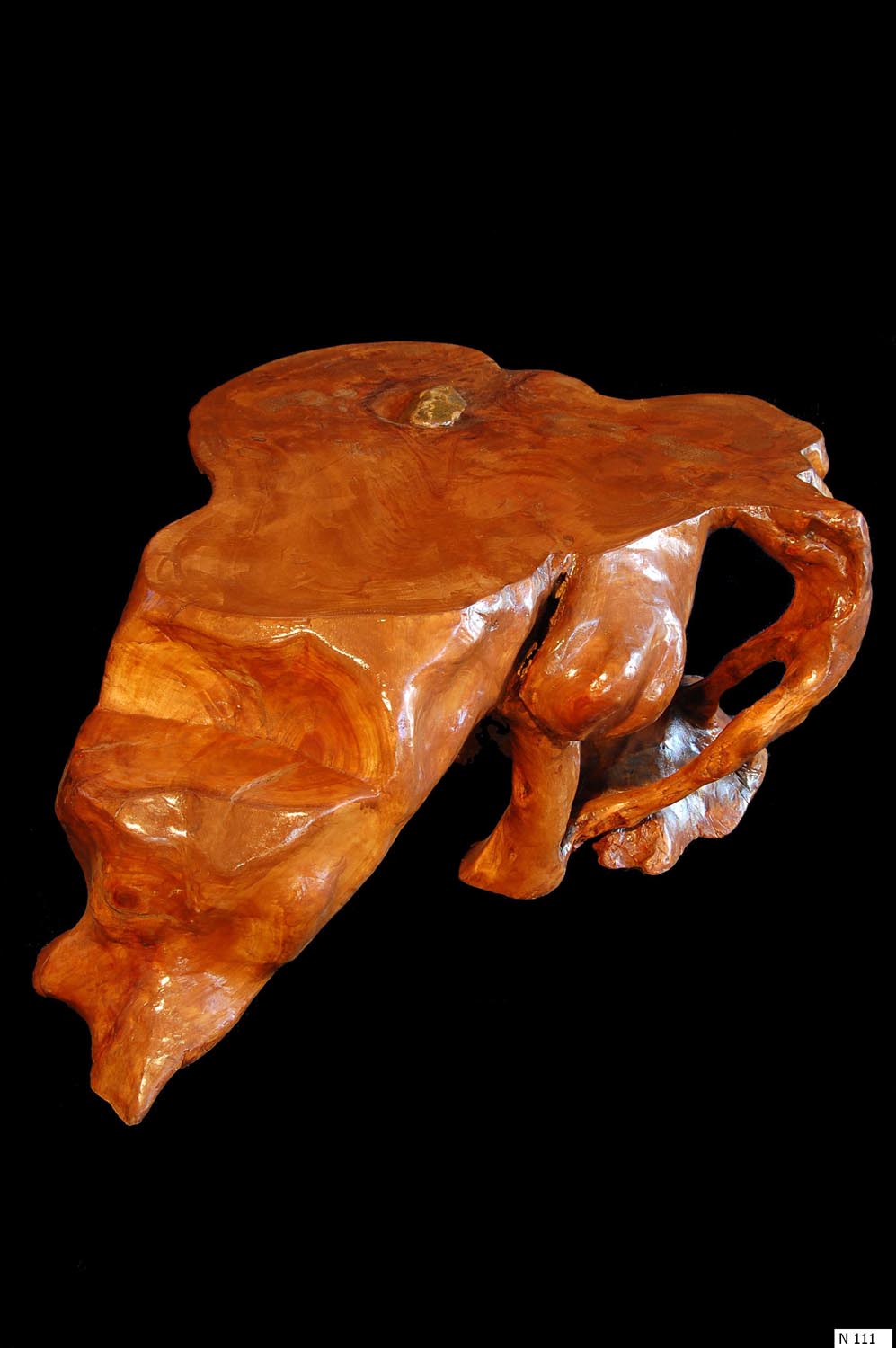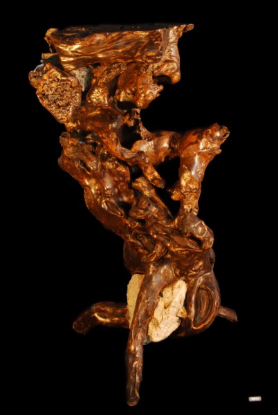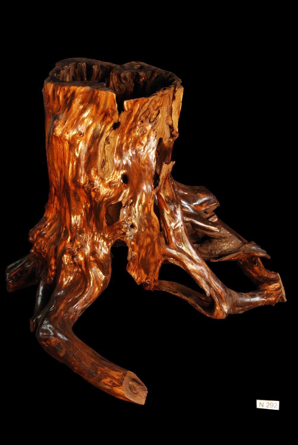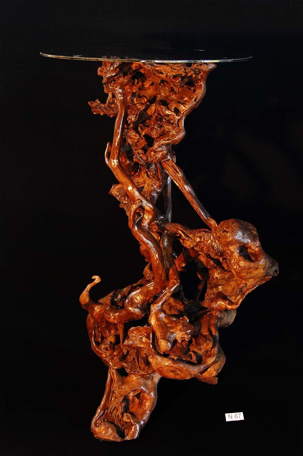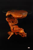 Description: Water fountain beautifully hand-carved from a single piece of drift wood (tree root) of intricate shape. An electric pump creates water flow from right to left, cascading down into a pool. Complete with fibre glass sabre toothed tiger drinking at the pool.