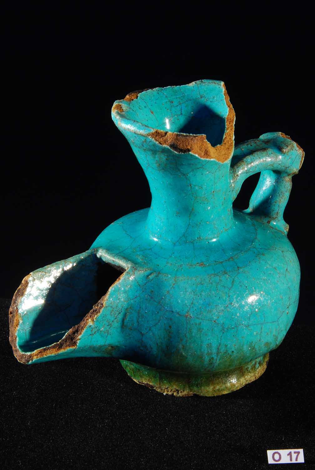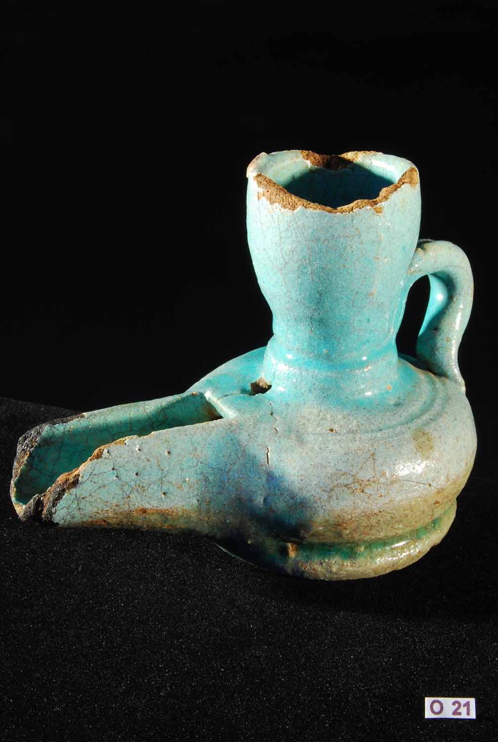 - 13th Century AD. Upright style lamp, slip painted in turquoise with high