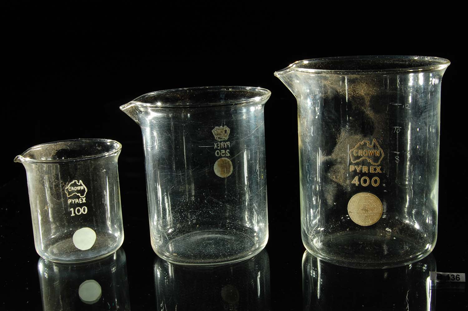 Description: Set of 4 Glass Beakers. Made by Schott,